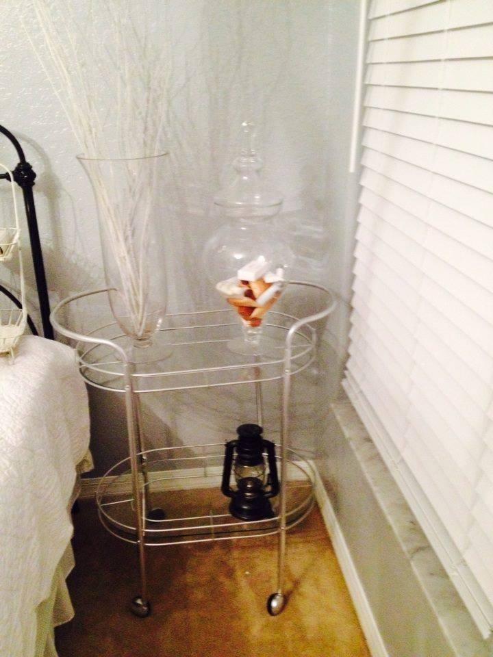This bar cart was retrieved via curb side pickup. It was gold and pretty ugly. Now it’s silver and shiny and is used as a bed side table in the guest room.