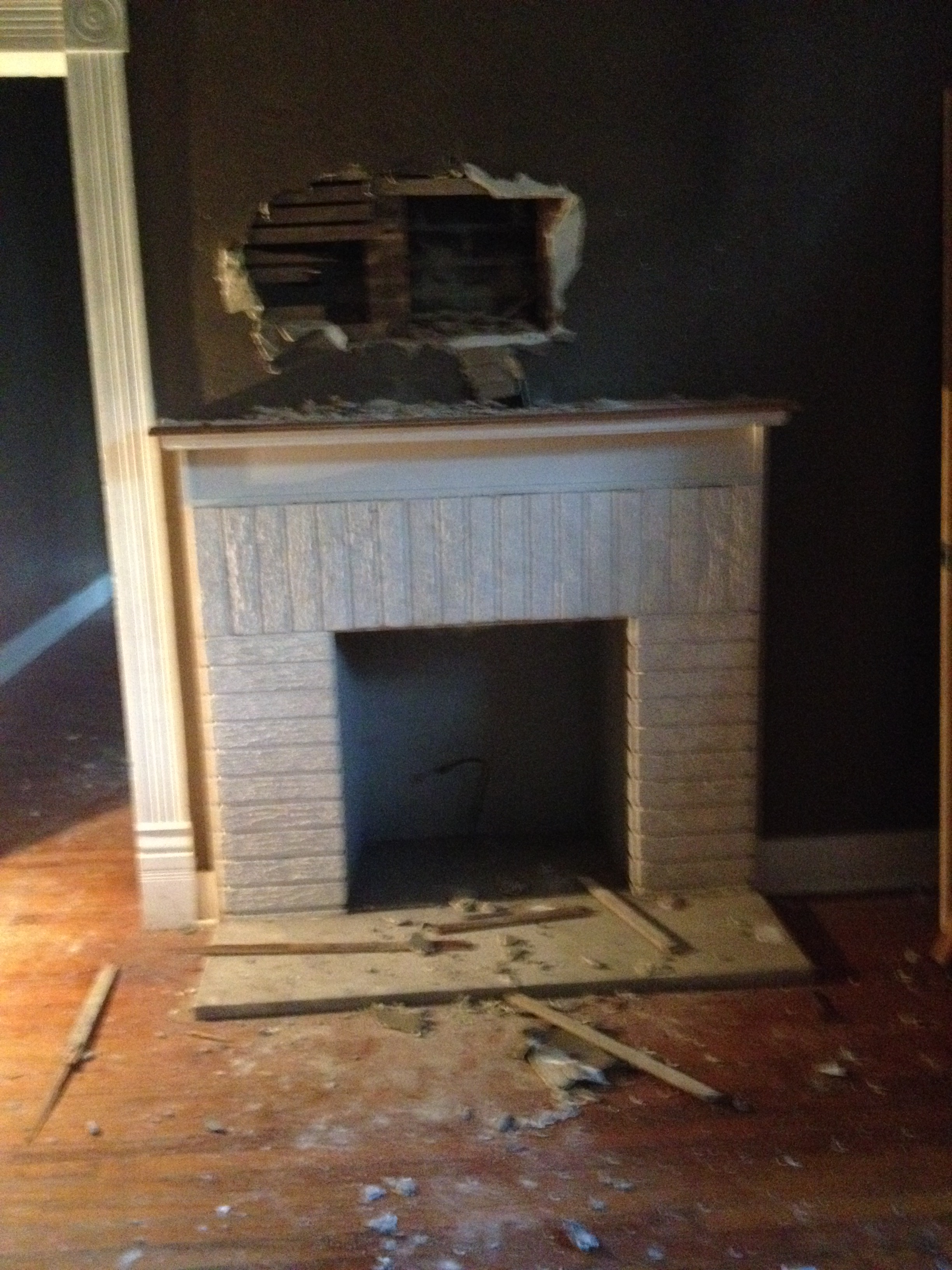 Here is a sneak peak in the big house. There was an off centered gas fed fireplace in the front room. You can see I was ambitious with the hammer. Through the plaster and lathe you can see a tiny bit of the BRICK CHIMNEY peeking though. No excitement at all.