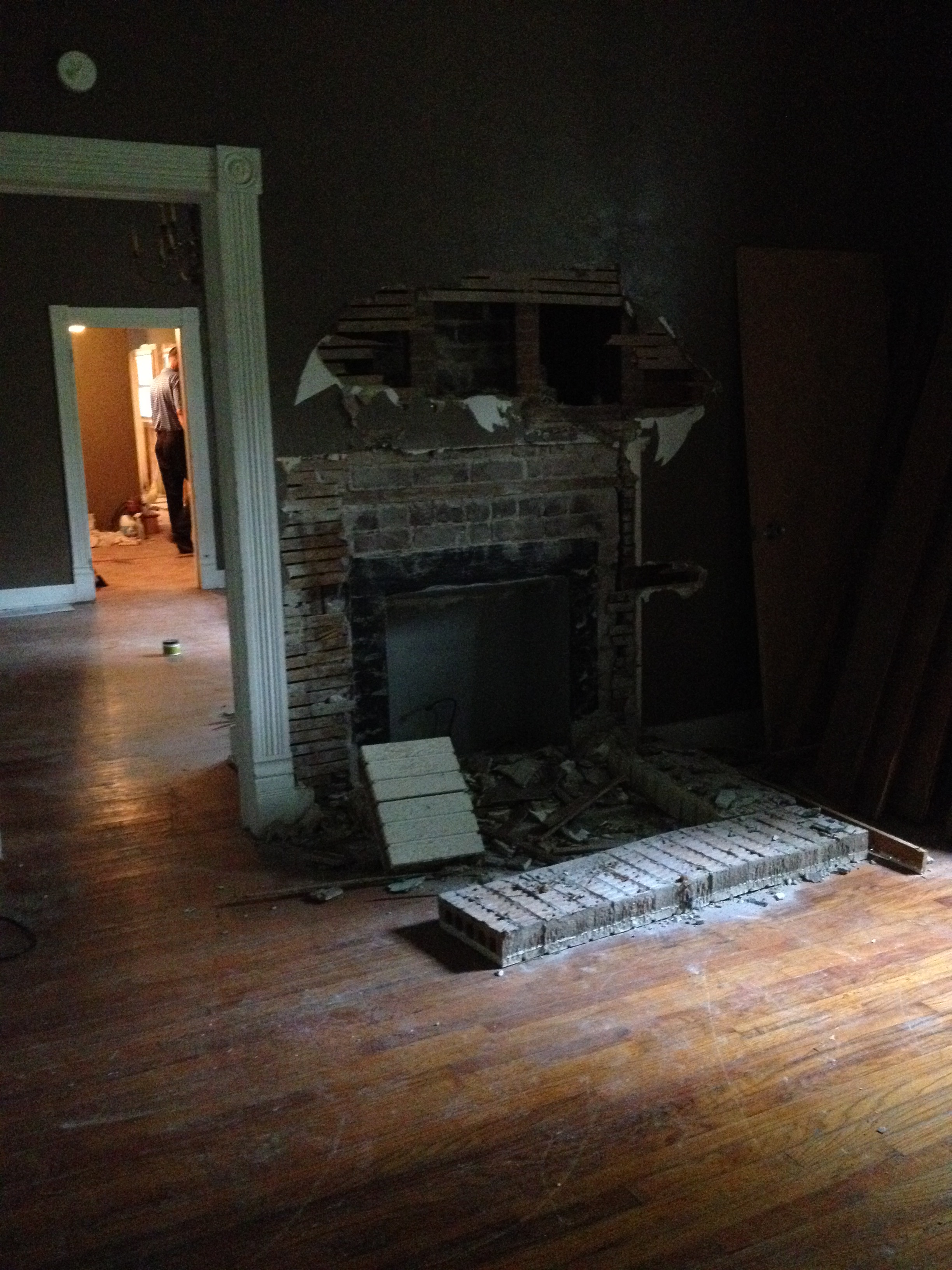 STEVE!!!!! I see brick!!!!!!!! A little pull here and a little push there and the mantle crashes to the floor. Exposes more of the 1903 brick fireplace.This weekend will include removing one more wall of drywall in the apartment, pulling out the bathtub and the nastiest toilet I have ever seen and continuing to chisel away on the fireplace wall in the big house. We will also be taking in a Gator game on Saturday night with friends. Gotta rest sometime.