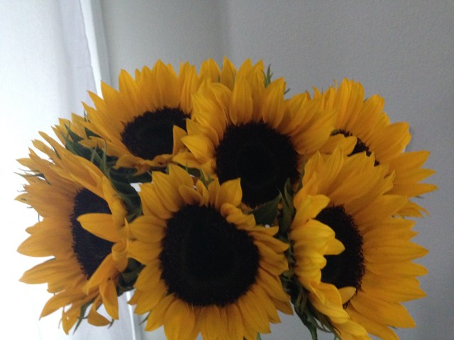 However this morning when I woke. The routine begins with letting JR out to go pee and get the newspaper for dad. And what do my wandering eyes do appear but a vase full of beautiful sunflowers and a card. I think to myself that Justin left these for Courtney to find this morning. Ah sweet cause I know they are not from Steve. He knows not to buy me anything for the dreaded Valentines Day.