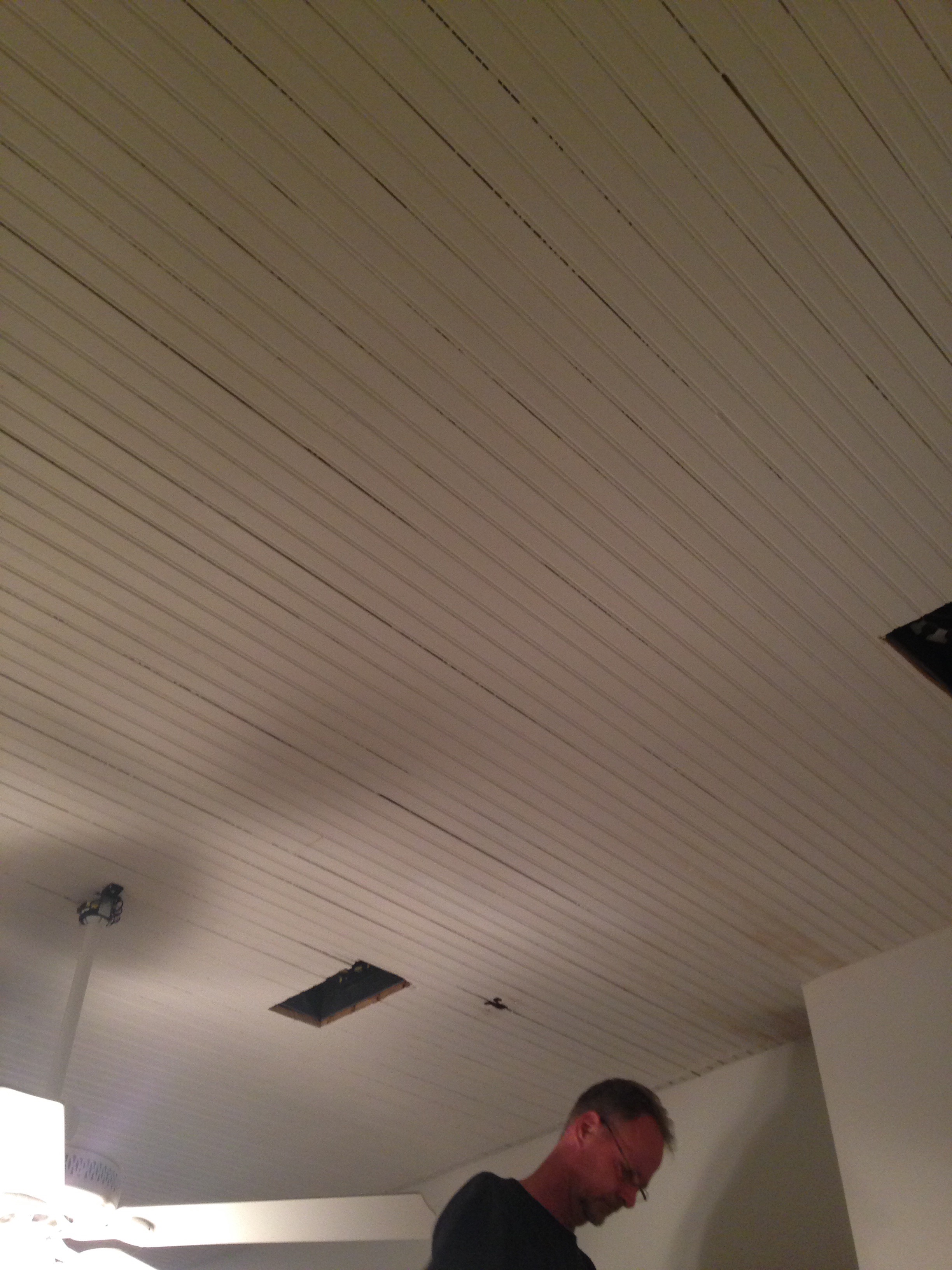 Last week Steve started on the ceiling. It needed repaired, sanded and last night it was painted. The original bead board ceilings good as new.