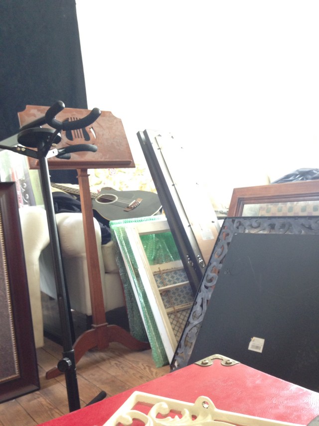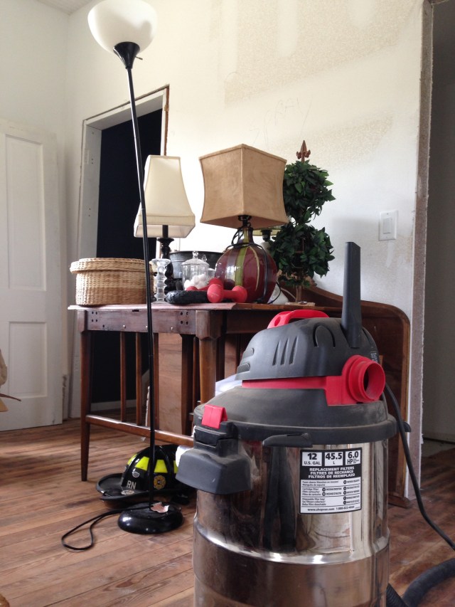 Oh my word ya’ll……..there is stuff everywhere. It’s all gotta go somewhere so this floor can be painted. Check out that crooked lamp. What in the world?