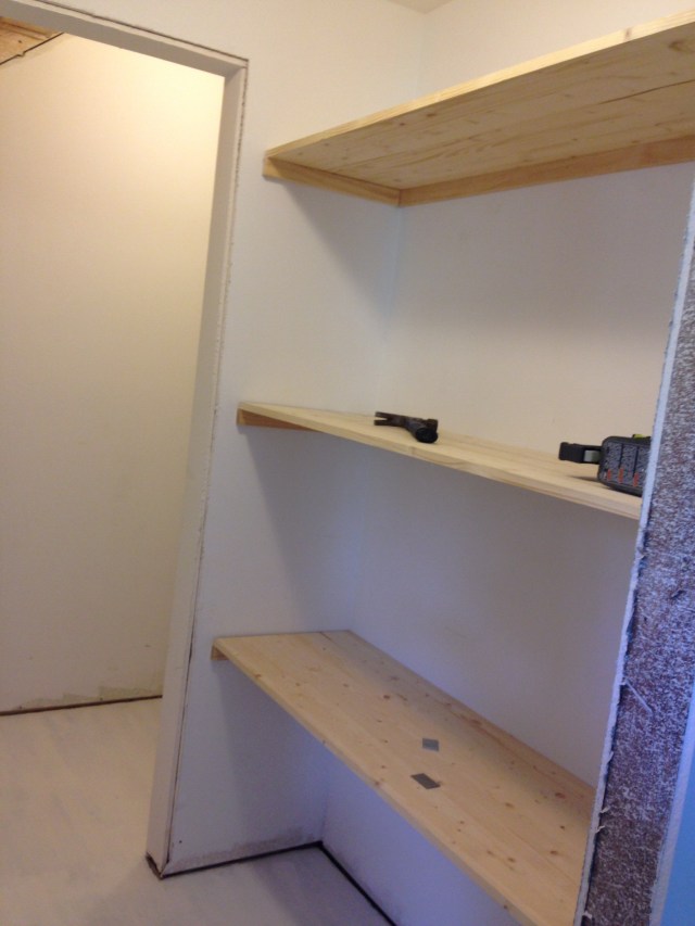 Mr. has been installing shelves. Can you say linen closet and office supplies?