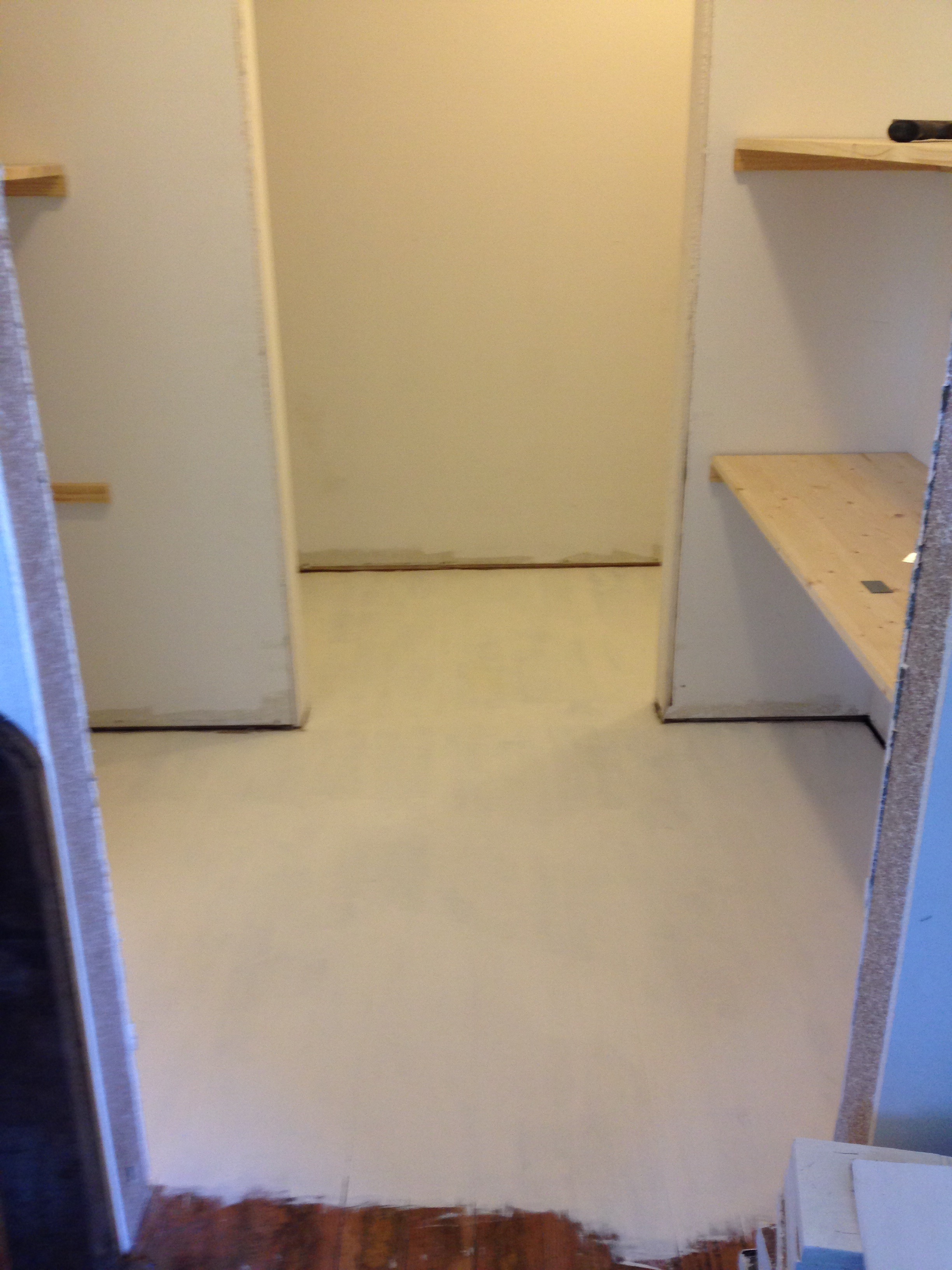 The first half of the room has two coats of primer and 1 coat of top coat. Today I finish the second topcoat and move to the other half of the room.