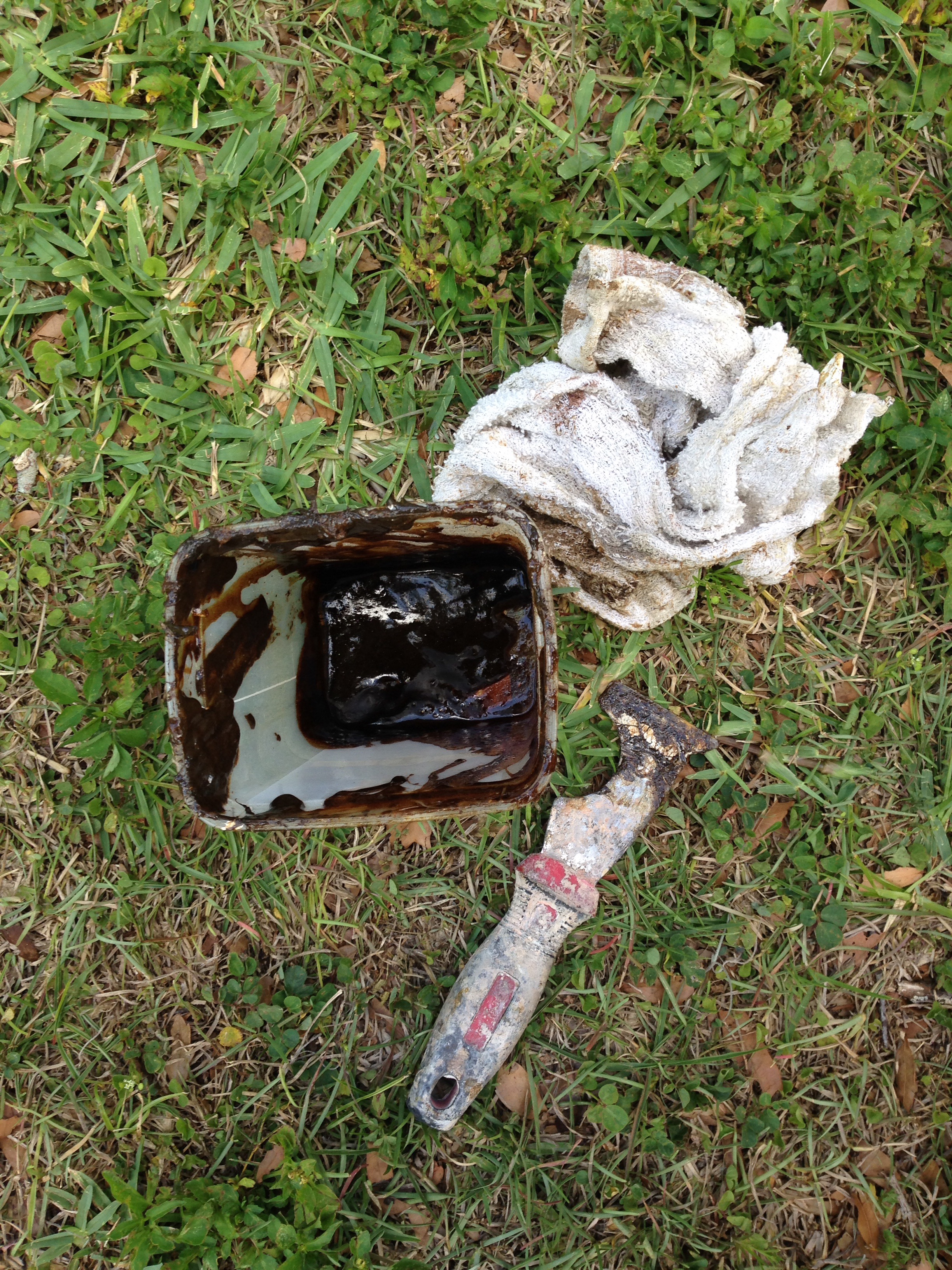 My least favorite thing is to strip off old stain. It’s dirty and slimy. The “new and improved” strippers that say it won’t burn your skin are worthless. If it doesn’t burn, it doesn’t work. So it’s brush it on, spatter it on your skin, complain a little, scrape off the goo.