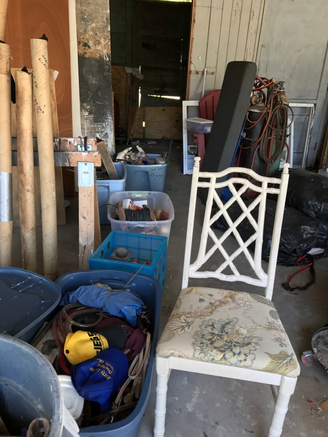 This chair was stationed strategically as I pulled plastic storage bins from a storage room that will be demolished very soon. The majority of the items in this storage were car parts. To be exact- Dads car parts.