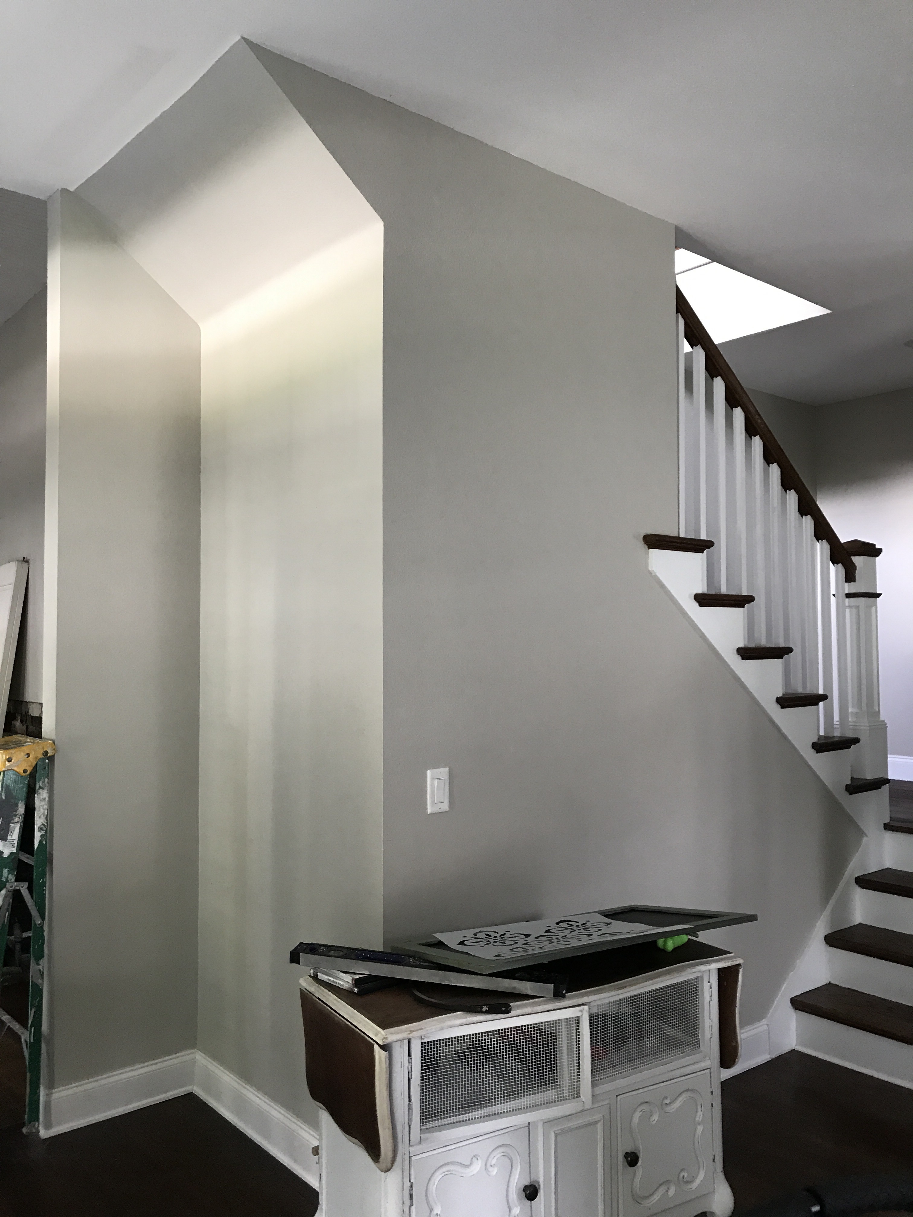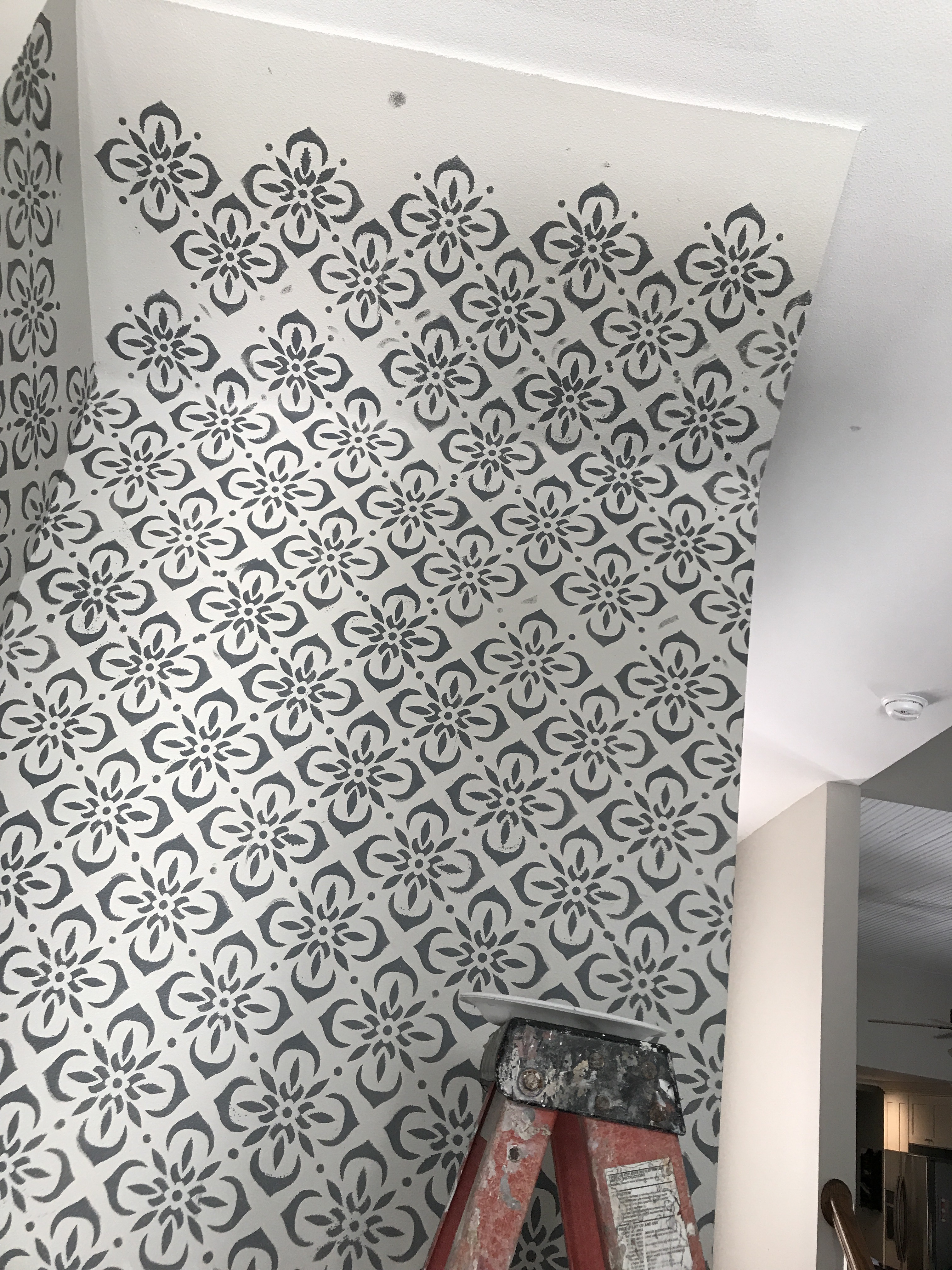 Good grief people, I climbed to the top of this 40′ ladder, taped the stencil on hanging halfway upside down and proceeded to paint the stencil while having little to hold onto. 40′ is the only thing I’m exaggerating on.