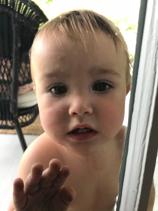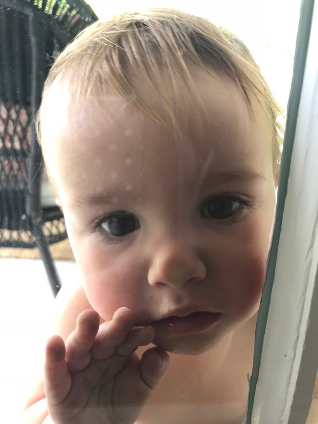 He pushes his face close to the window as he tries to figure out why he can’t get to me.