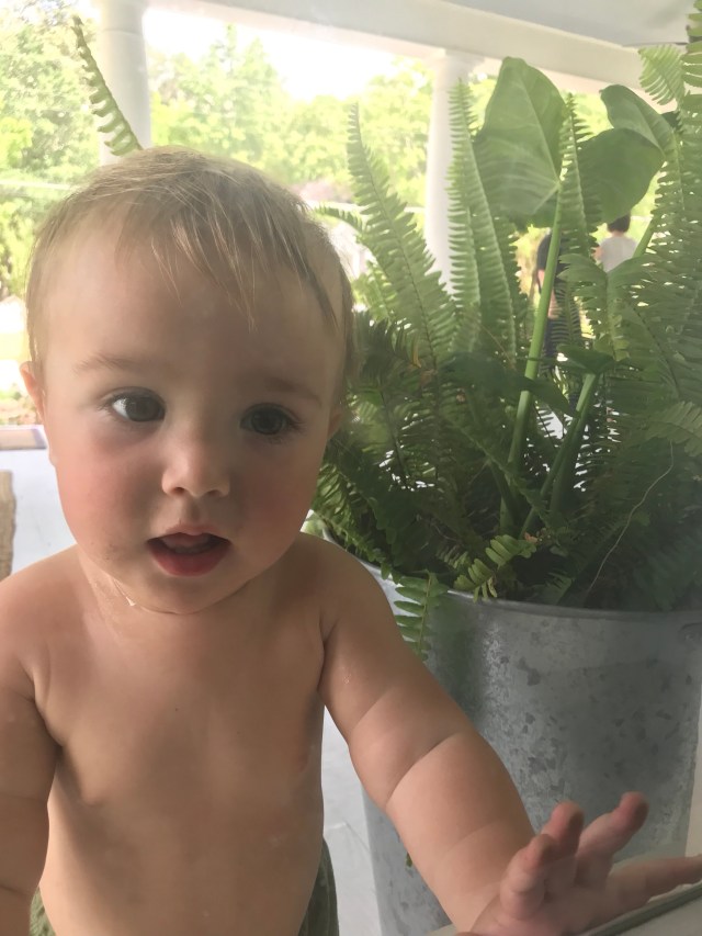 Today after two long years, as the fireplaces were being repaired and I cleaned up after the dirty dusty job, I see a baby on the front porch. He is getting so big and he loves being outside.