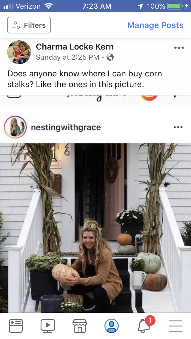 As we peruses through the aisles gathering our supplies, I remembered that FB friends said they saw cornstalks at Lowe’s. Let’s get some!!