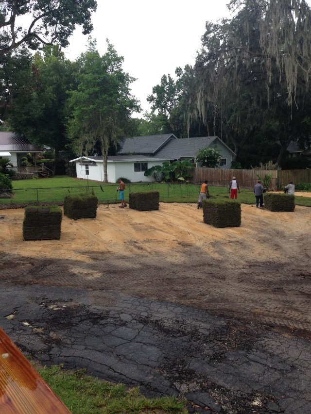 We chose to have a company come in and clear out the trees. 40+ trees were removed. This left us with a football field of grass. It was clean and a beautiful blank slate.