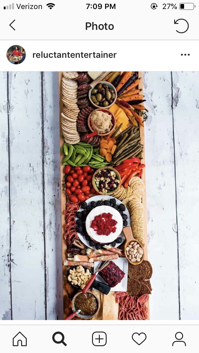 I perused IG for a while this morning and saw this picture from #thereluctantentertainer. This lady is a pro at charcuterie boards. You know…. huge platters with all kinds of different items showcased on one board. You know!! Charcuterie.