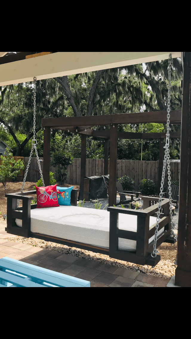 The beautiful wooden swing bed now hangs in our pool house. It has a cute cover that sweetest friend Becky gave me 5 years ago when the swing was meant to be installed. I’ve carried the cover along as we moved because one day I knew the swing would be the perfect addition to the old house.