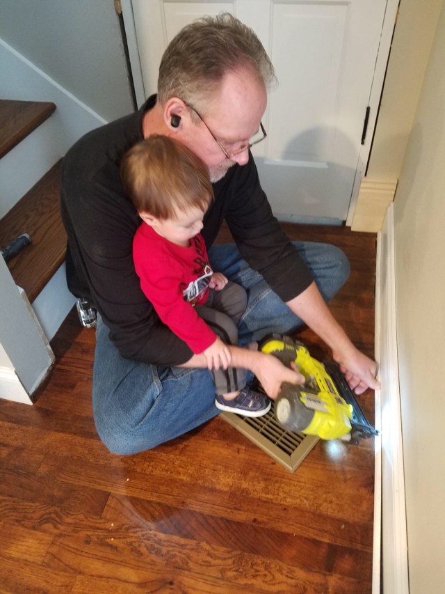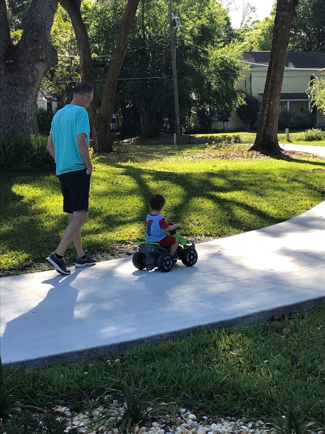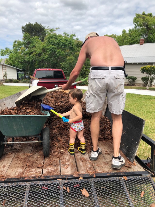 When you are almost two, you love to help. It’s fun to push the garbage cans to the road with a little assistance from Papa.