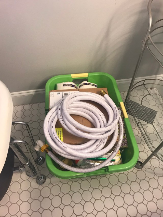 Real life is seeing the items currently in your bathroom. These include a laundry basket full of items that will be used when a baby comes because soon there will be a birthing pool in this room.