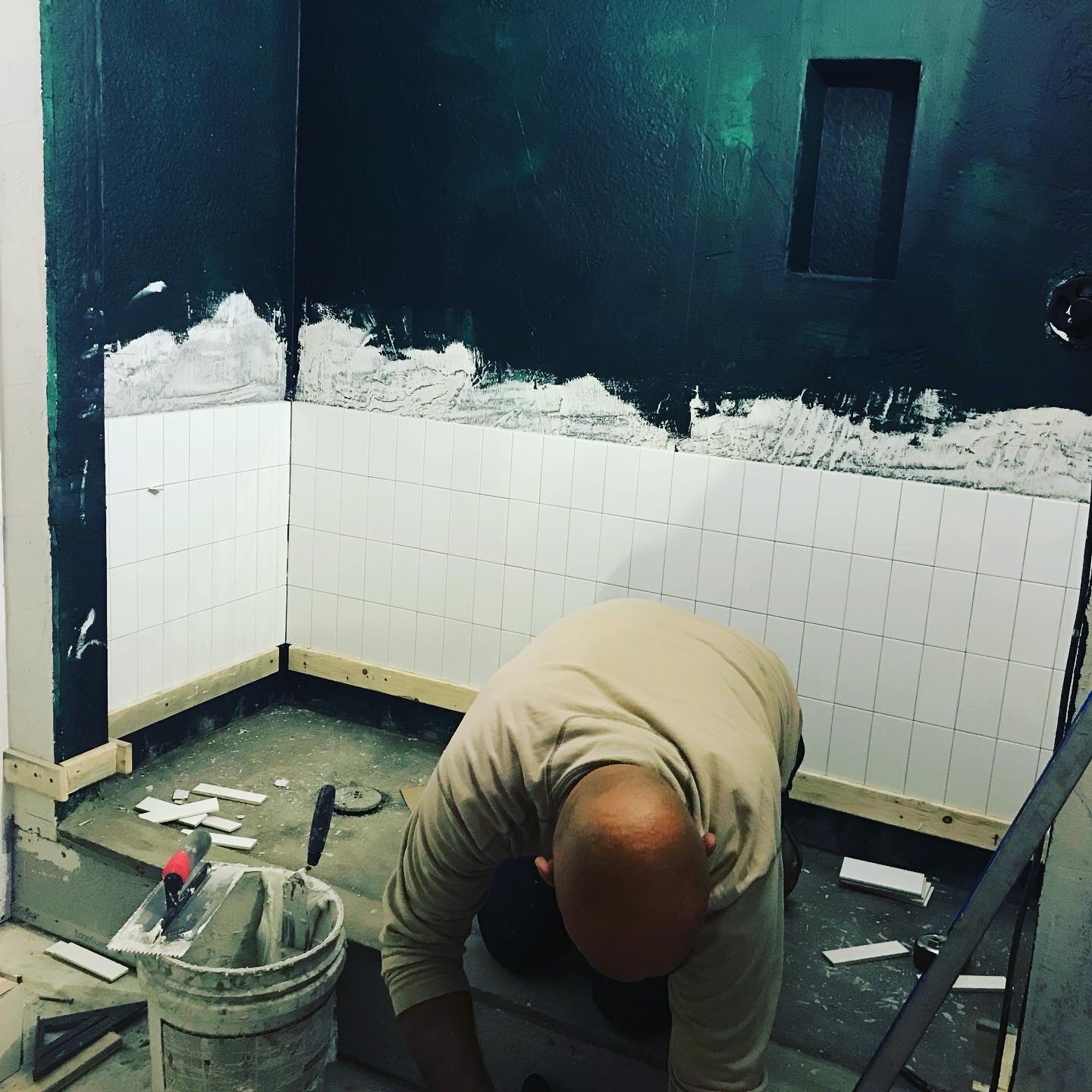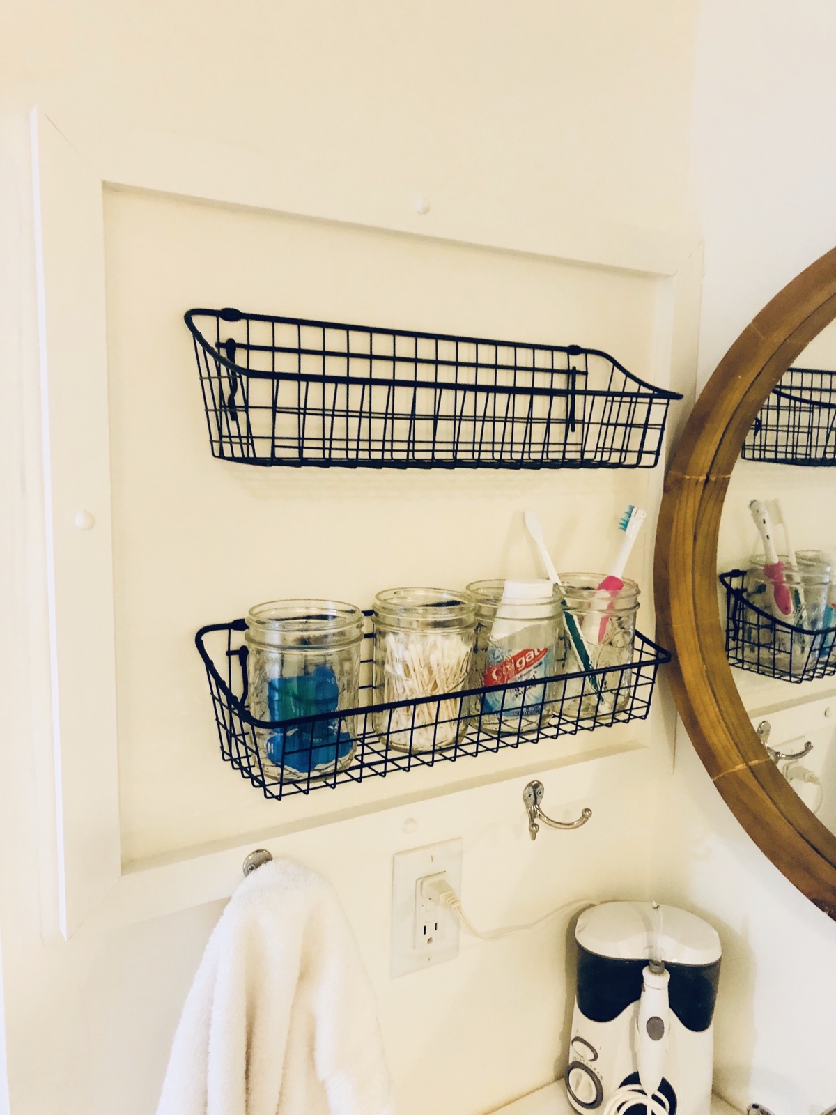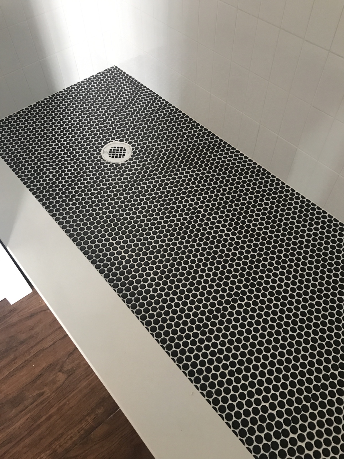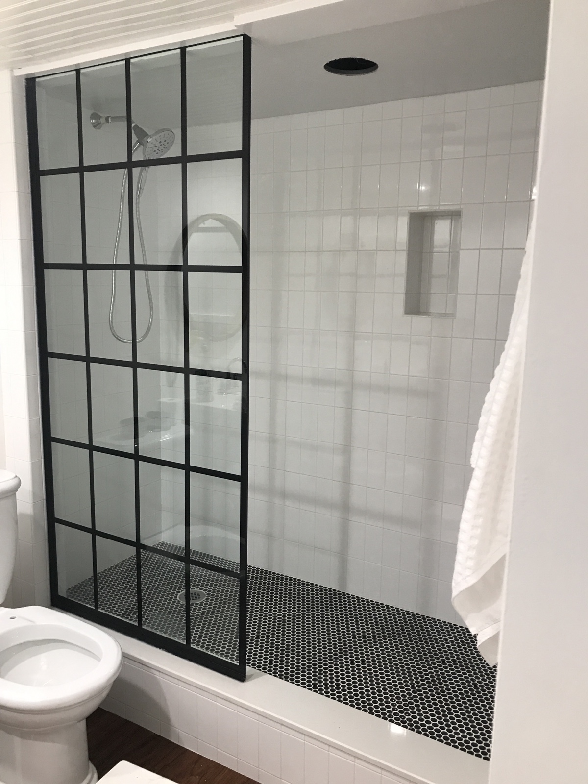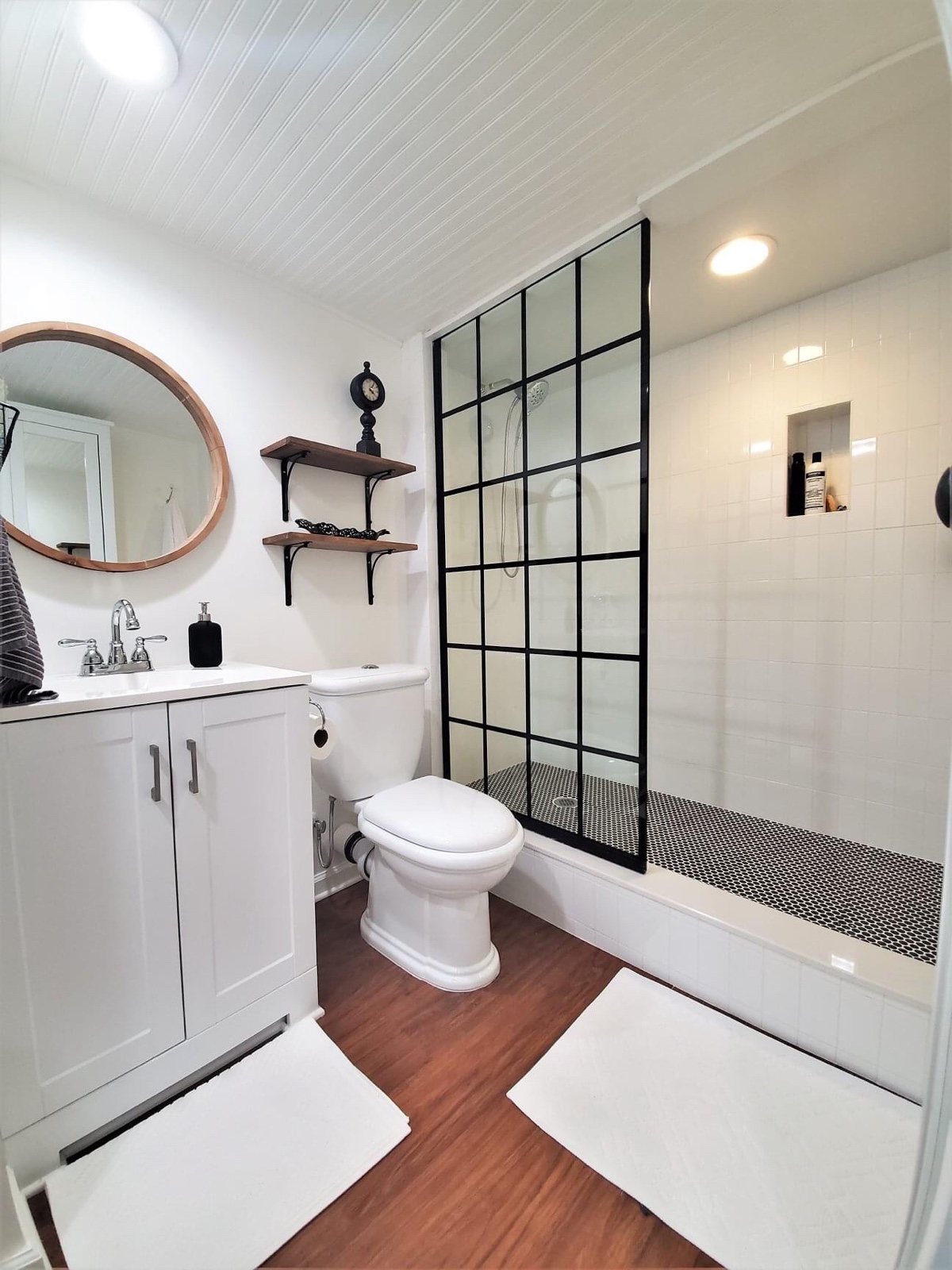 The first step was tiling the shower. White is my jam. I knew I wanted subway tile but how would it be laid? I saw a photo of a stacked pattern and knew immediately that’s what I wanted . Sticking with the black and white theme of the house, we added black penny tile for the shower floor. The entire apartment floor is waterproof vinyl planks that match identically to my original 1903 hardwoods in the main house.The icing on the cake The cherry on the top The whipped cream The fixed shower wall! It’s my favorite of all favorites, can you tell? I ordered it three different times and it came broken every time. I thought about giving up but the fourth time was the charm. 😍😍😍😍😍😍😍😍😍😍😍😍😍A slim IKEA cabinet added for towels and such fits the space perfectly The vanity was a single so the counter space was lacking. There was room on the wall that was already being used as an access for the washer/dryer. A couple of cute basket with jars that can hold a toothbrush and other necessities was the perfect choiceA full size stack washer and dryer makes going to the laundromat obsolete A simple vanity The cutest of wooden mirrors Some wooden shelves finish the space