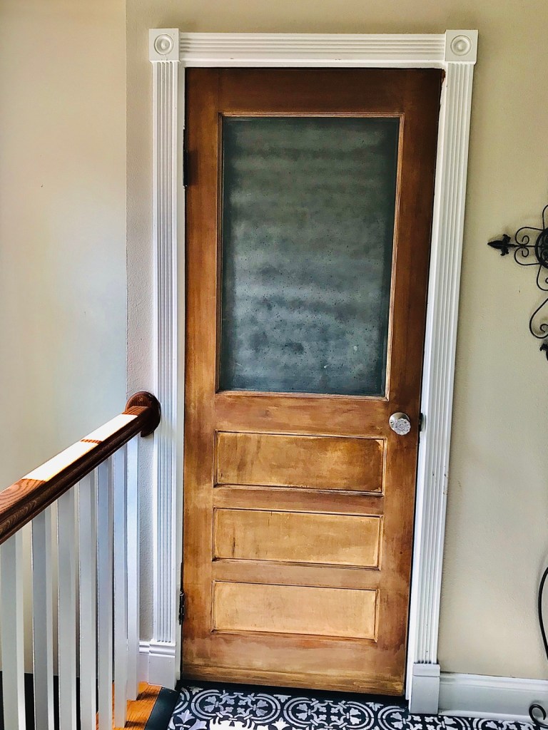 While I do not love the spray on the window (necessary since it’s on a bathroom) I do love that it looks like an old door that you might have seen years and years ago, which fits our house perfectly.