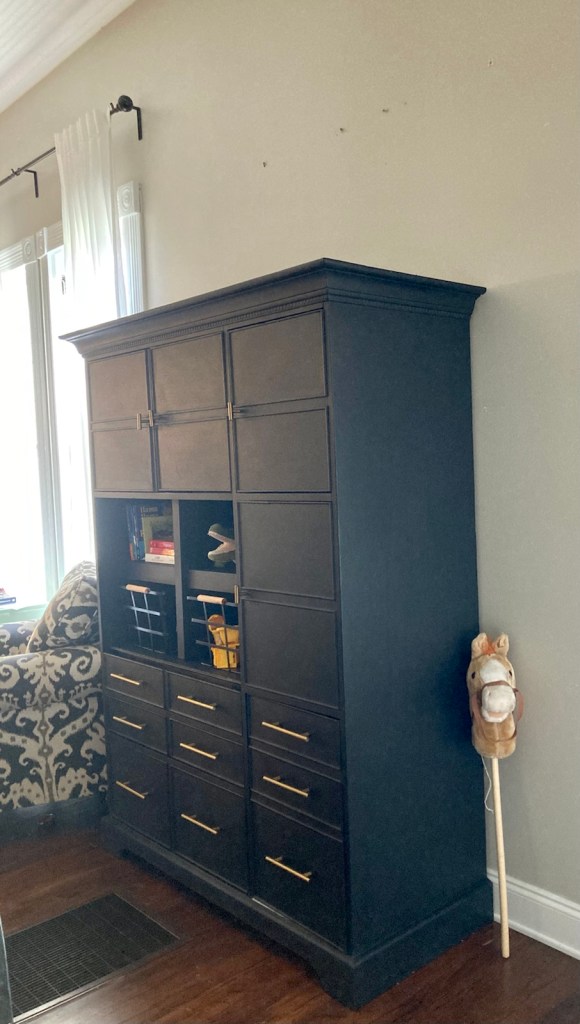 The whole reason for the cabinet is to hide a plethora of toys, books, puzzles, monster trucks….. and all the things little boys like to play with.
