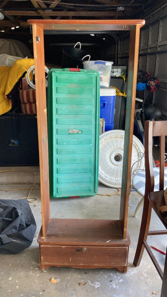 While at The Interfaith Thrift Store (my favorite) a couple of weeks ago, I spotted this big cabinet with lots and lots of doors/drawers. While it’s an ugly shade of orange wood currently, I’m all about a change up.
